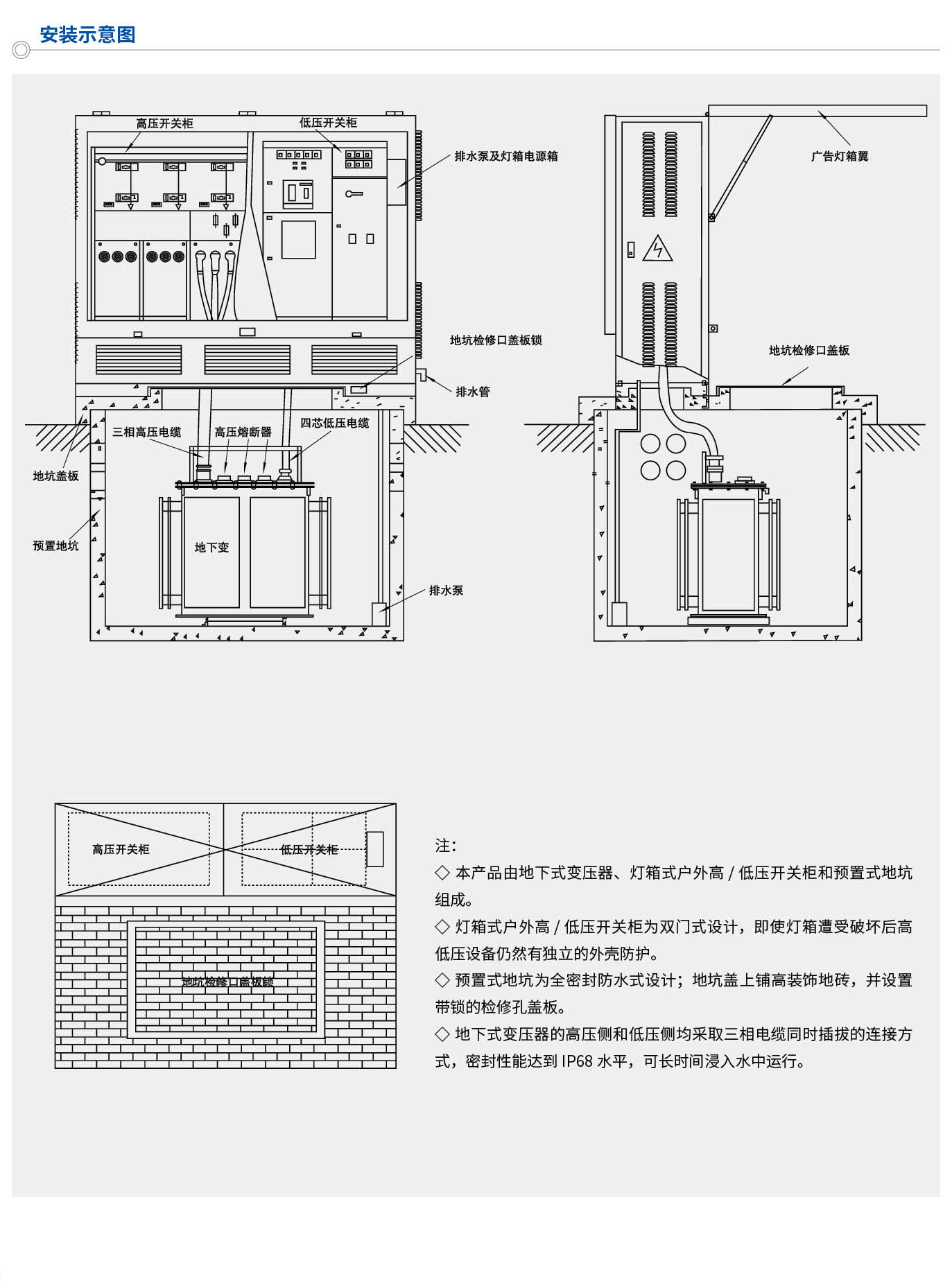 景观式地埋变电站主要由安装在地下的地下式变压器(含预制式地坑)和安装在地上的户外广告灯箱式高低压开关设备两部分组成。其中,地下式变压器是一种带有高压熔断器保护,能够一段时间内侵没入水中运行的新型配电变压器,在我国的机场、高速公路、桥梁、隧道等场所已经有了较为广泛的使用;户外灯箱式高低压开关设备的内部为户外高低压配电柜,箱体外侧为广告灯箱。可以根据周围环境、用户要求设计广告面的内容。整个产品占地面积小,美观大方,不但能与周围环境高度协调,还能实现广告作用。